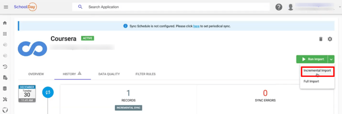 The Coursera integration now supports an incremental sync mode for Content and Enrollment data. This mode updates only records that have changed since the previous successful sync instead of reprocessing the full dataset. This reduces sync time and network usage while keeping course data and student enrollments up to date.